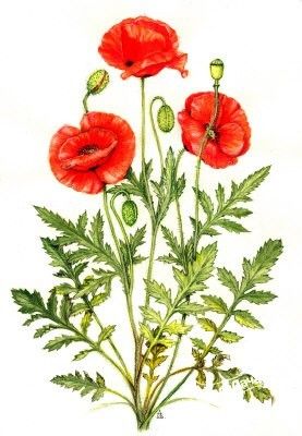 Цветки мака растут на верхушках стеблей. Лепестки ярко-красного, иногда розового либо белого цвета.