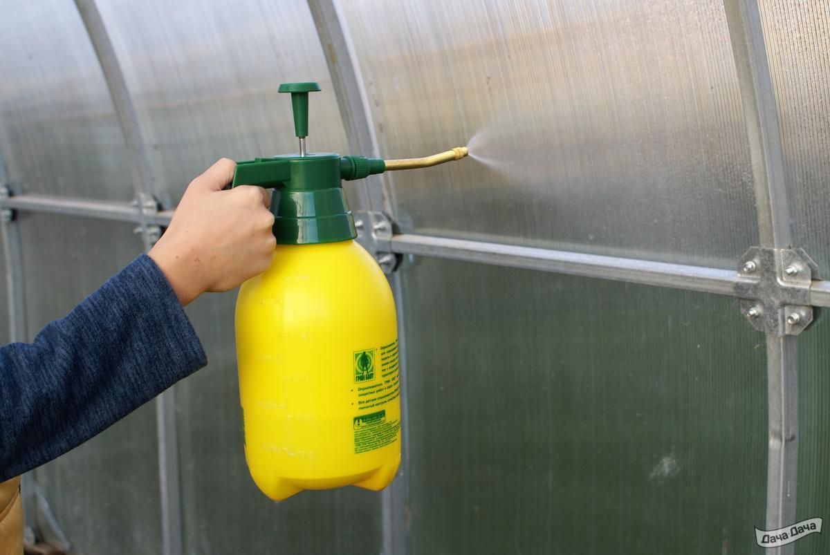 После того, как теплица вычищена и отмыта, дайте ей просохнуть постоять в чистоте несколько дней. Затем обработайте дезинфицирующими средствами от вредителей. Средства лучше покупать в садовых магазинах.