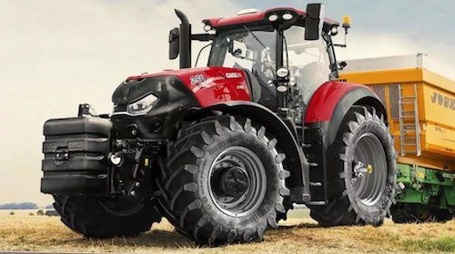 Новая модель красного цвета улучшенного дизайна. У трактора сдвоенные задние колеса. Двигатель мощностью 132 лошадиные силы меньше загрязняет воздух и может работать в любой зной благодаря системе охлаждения "Тропик". Общий объем топлива с учетом дополнительного бака составляет 250 литров, что хватает на всю смену.