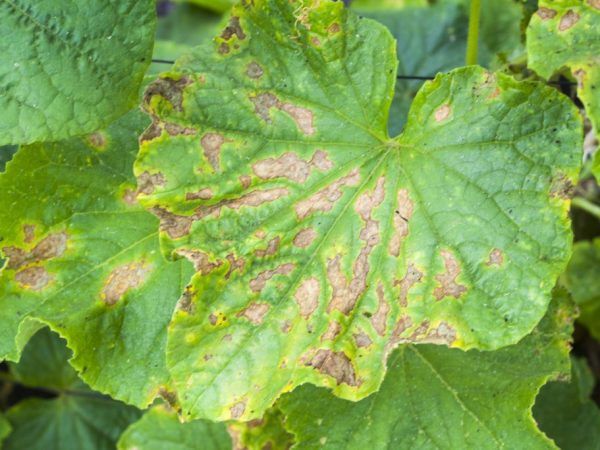 Эта болезнь захватывает листья огурцов, покрывая полностью пятнами. Постепенно пятна захватывают весь лист и лист выглядит, как обожженный.