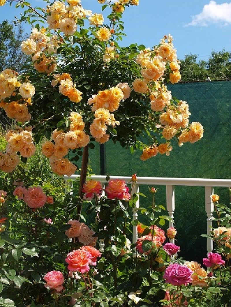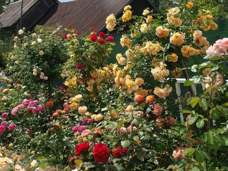 При использовании роз для драпировки стен дома, гаража, забора ит.д. розовые кусты размещают таким образом, чтобы наиболее высокие растения высаживались на задний план.Это могут быть плетистые розы, сильнорослые кустовые розы, розы на штабе. Далее высаживается группа из 3-7, в зависимости от размера рабатки, кустов розы Флорибунда и столькоже Чайногибридной розы, подбирая сорта по высоте.