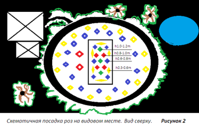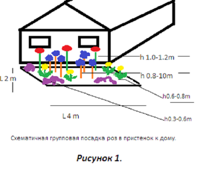 Далее высаживаются розы Патио,Миниатюрные, Почвопокровные. Примерная схема размещения растений, высаженных в пристенке дома представлена на рисунке 1.