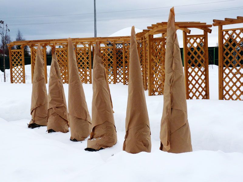 Подготовить деревянные каркасы для растений. Каркас необходимо подстраивать под конкретное растение как по обхвату, так и по высоте, чтобы зимой оно не пострадало. После подготовки стенок каркаса обматываем его укрывным материалом. Полиэтилен для этих целей лучше не использовать, так как он собирает влагу. Накопившаяся под плёнкой влага в зимние холода замерзает и не способствует теплоизоляции либо приводит к загниванию и появлению плесени. К тому же полиэтилен может не выдержать низкой температуры и лопнуть, дав возможность проникновению снега и холодного ветра.