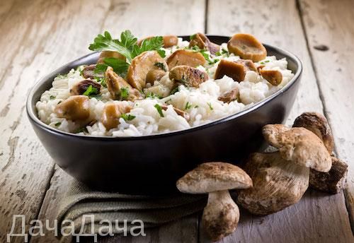 2. В другую сковороду положите кусок сливочного маслица и добавьте промытый рис, поджарьте его до прозрачности, пока не впитается все масло. Далее, постепенно, по кружке подливайте бульон, не забывая мешать. Не забудьте: пока готовится рис — грибы не должны остыть, держите их в тепле.