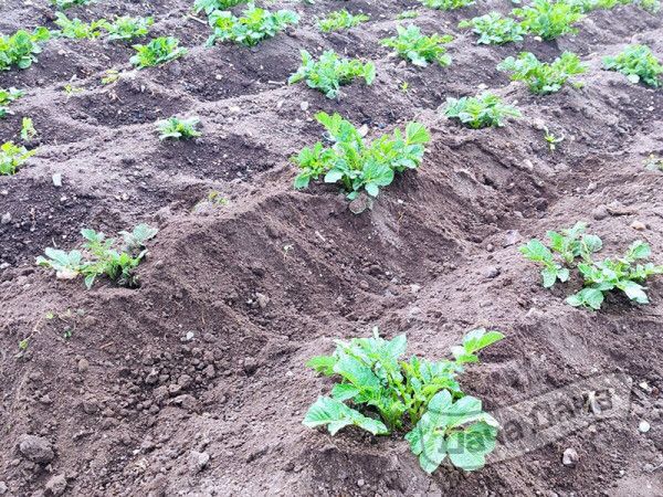 Едва появятся первые кустики картофеля, проводят окучивание. Высота кустиков должна достигнуть 8 см.
