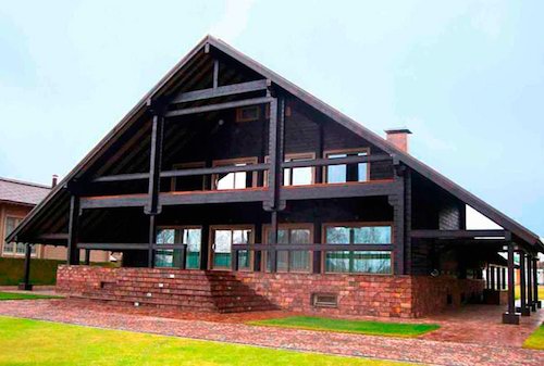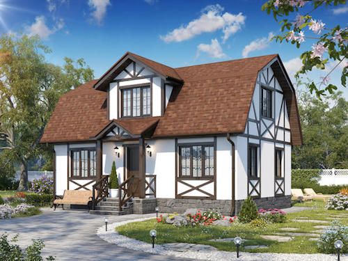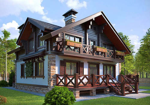 Кровля серых тонов, имитирующая состаренный металл, либо фиолетовая. Цвет фасада темно-зеленый, серый, глинисто-коричневый. Однако может быть и насыщенных цветов, и нежных пастельных, главное, чтобы цвет фасада контрастировал с крышей дома.