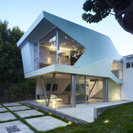 Здесь не предусмотрено яркого цвета фасада или вычурных выдающихся элементов, но такой дом вы можете выделить путем модерновой подсветки. Высокотехнологичные осветительные приборы выгодно выделят металлическую фактуру здания, что придаст поистине космический эффект.