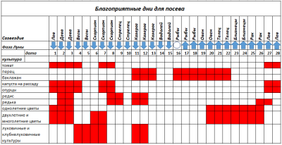 Наиболее благоприятная для посева, с учетом Лунного календаря, первая половина февраля. Данные представлены в таблице.