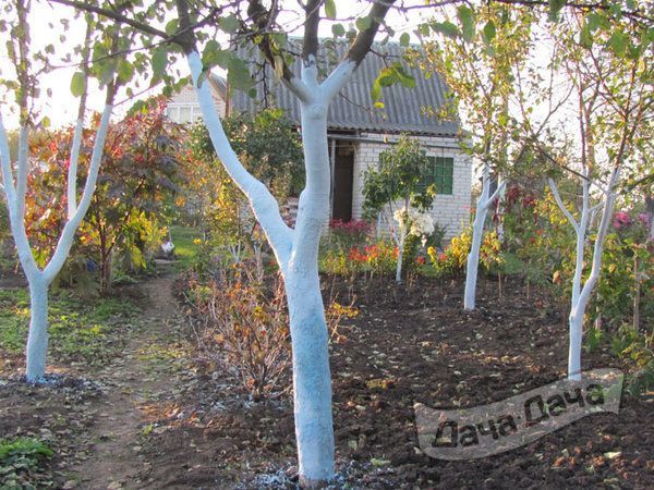 В ноябре стволы деревьев нужно побелить, чтобы не было ожогов и морозобоин. Белить лучше всего побелкой на основе глины или акриловой краской для садовых деревьев. Слой наносят несколько раз до основания первых основных веток деревьев - высота побелки должна достигать - до 1,6 - 2 м. на почвой. Если слой сойдет от снега с дождем, то всю процедуру повторяют в конце февраля.