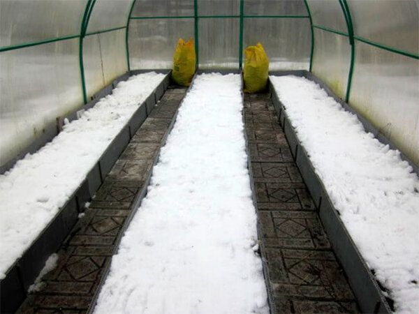 Если снега в теплице нет, то полезно набить ее снегом, который вы собрали вокруг теплицы. Это следует сделать, чтобы восстановить в грунте теплицы влагу, при таянии снега, которое произойдет во время наступления тепла.