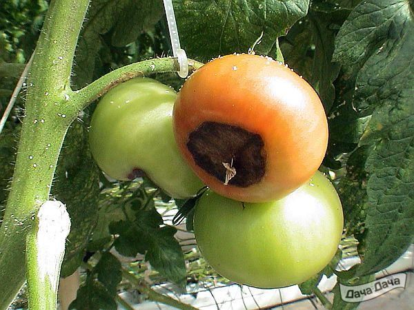 Бурая гниль – развивается и портит только плоды. У плодоножки образуется пятно, которое растет вокруг нее. Кожица помидора в месте пятна, вдавливается внутрь. Пятно больше не растет, а гнилью поражаются внутренности плода.