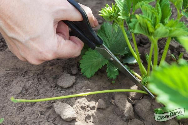 Если дачник не будет размножать клубнику усами, то их нужно удалить. А если вы будете размножать усами, то нужно срезать листья и оставить усы. Хотя обычно дачники этого не делают, потому что усы будут слабыми, так как они все силы отдали ягоде и урожаю клубники. Такие кусты со временем будут лишь вырождаться. Поэтому кусты первого года посадки не нужно размножать усами, их не стоит трогать. А вот на второй год с этого куста уже можно взять усы для размножения.